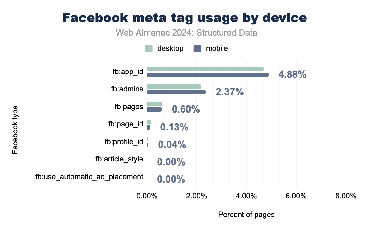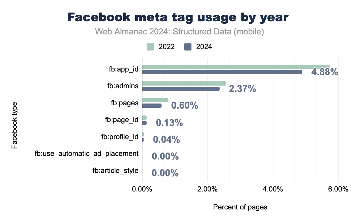 Facebook-specific meta tags have seen a marked decline in usage between 2022 and 2024, reflecting the broader industry shift toward Open Graph as the preferred format for social sharing metadata. The fb:app_id tag, once widely used to integrate apps with the Facebook platform, now appears on only 4.9% of mobile pages, down from previous years. Similarly, administrative tags like fb:admins have dropped to just 2.4%, serving primarily for backend management rather than enhancing content visibility.
