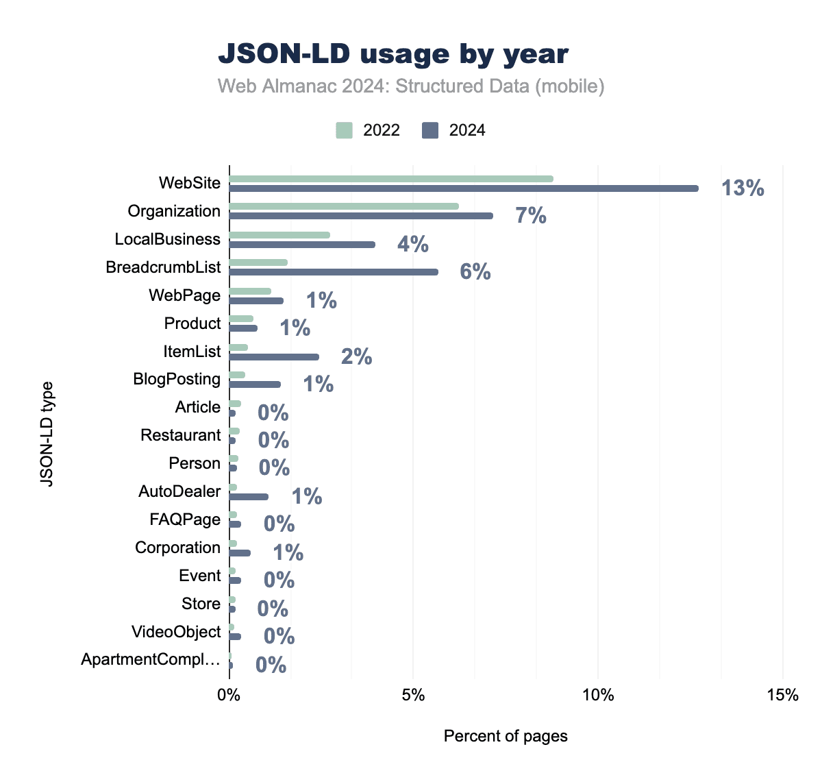 JSON-LD types continue to be widely implemented across websites, with varied types of data used depending on the purpose of the site. The WebSite schema leads adoption, appearing on 12.73% of mobile pages, followed by Organization and LocalBusiness types at 7.16% and 3.97%, respectively. These types are crucial for establishing entity identity and providing contextual information to search engines.