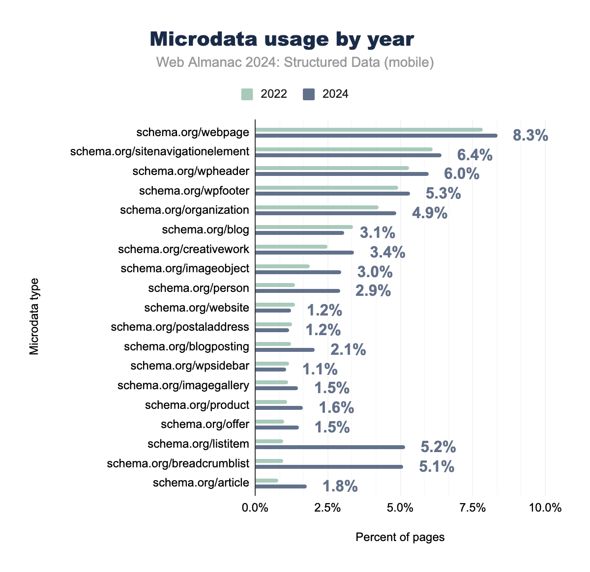 Microdata continues to be widely used for structural elements and navigation data, particularly within legacy platforms and sites where simpler, static page structures are required. The most frequently implemented types include schema.org/webpage (appearing on 8.34% of mobile pages) and schema.org/sitenavigationelement (used on 6.42% of mobile pages), indicating the format’s enduring relevance for webpage structure and site navigation.