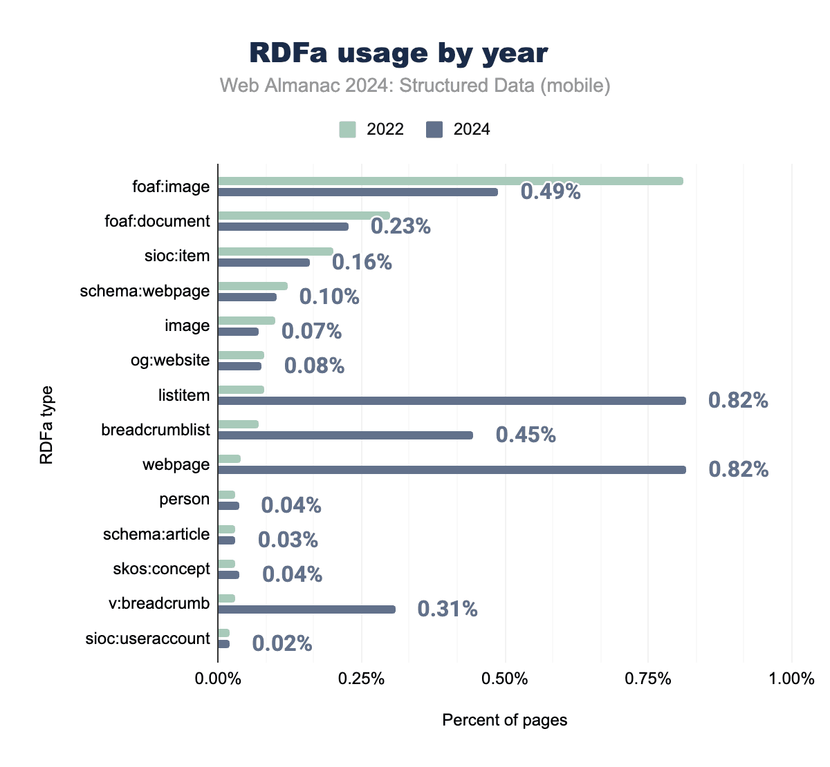 Figure 3.23. Year-on-year comparison of Microformats2 usage on mobile pages in 2022 and 2024.