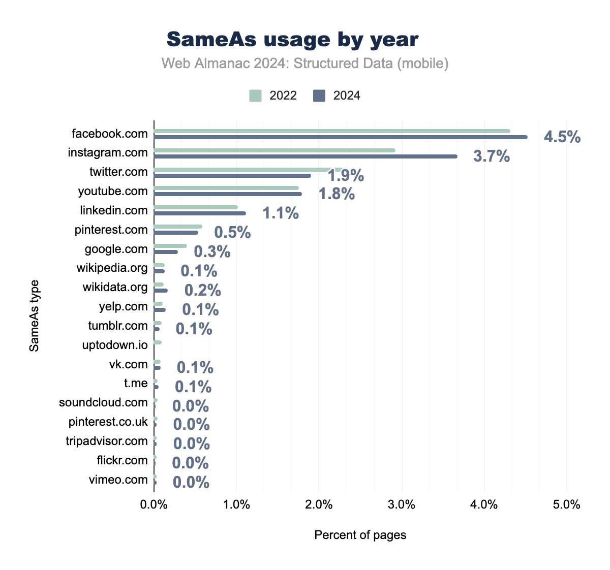 Figure 3.35. Year-on-year comparison of sameAs usage on mobile pages in 2022 and 2024.