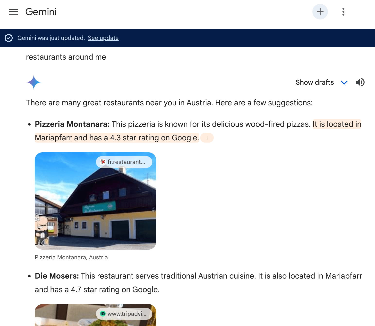 Figure 3.1. Search results in Perplexity, showcasing a map view with listings of local restaurants.
