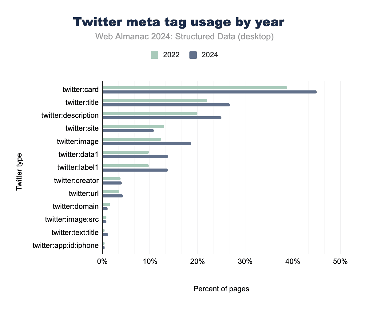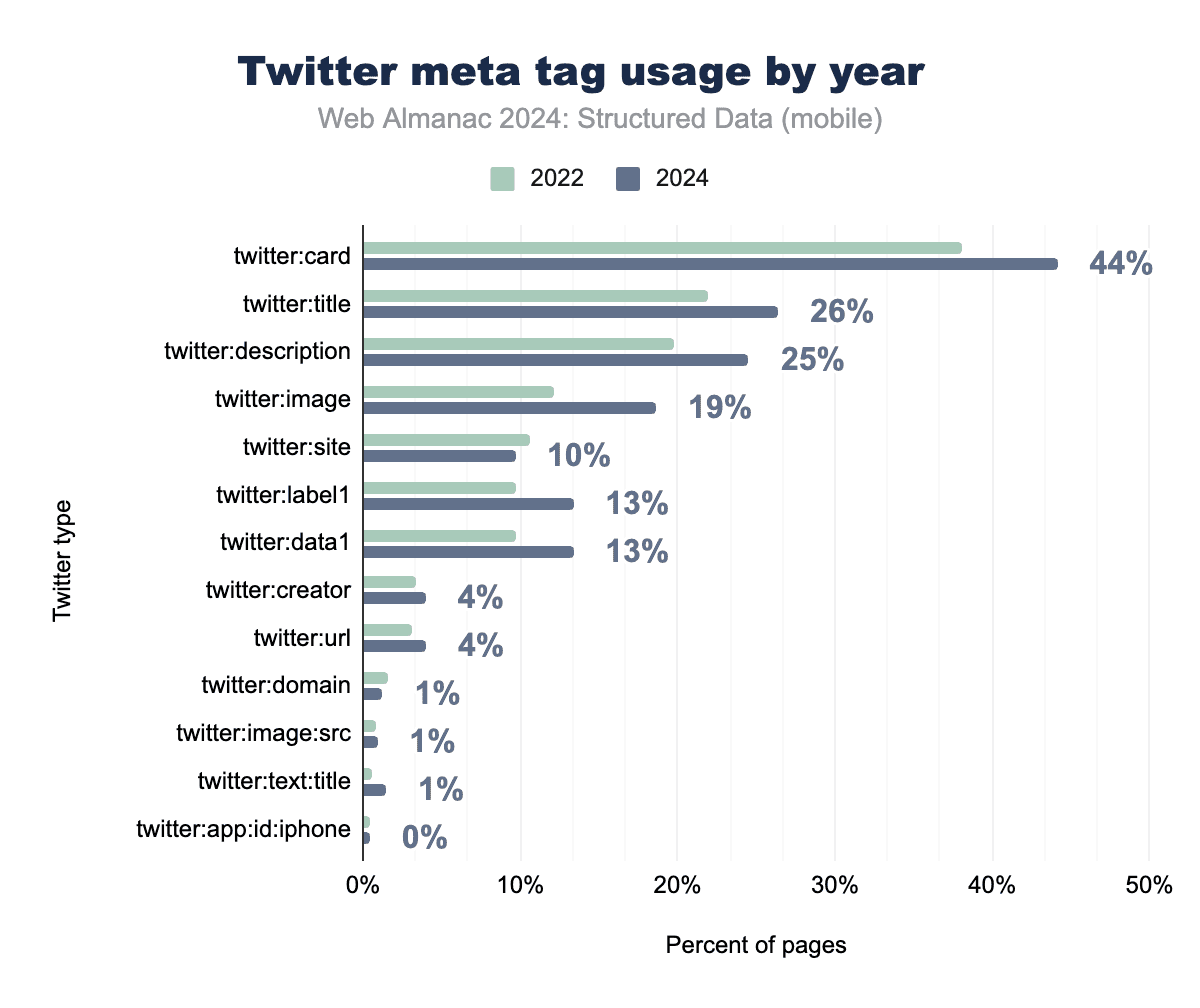 The platform’s enhanced metadata properties, such as twitter:data1 and twitter:label1, which support rich card features, have seen coordinated growth, now appearing on 13.36% of mobile pages. This indicates the increasing use of Twitter Cards for more detailed content representations, such as for product listings or event details.
