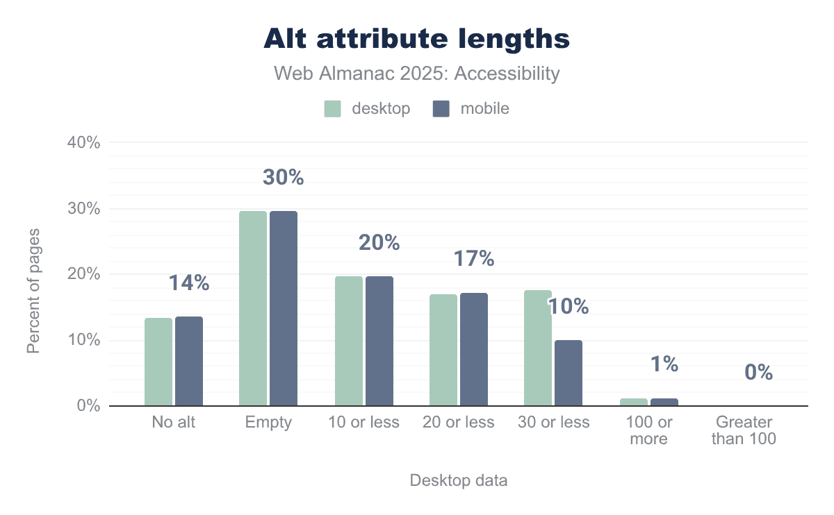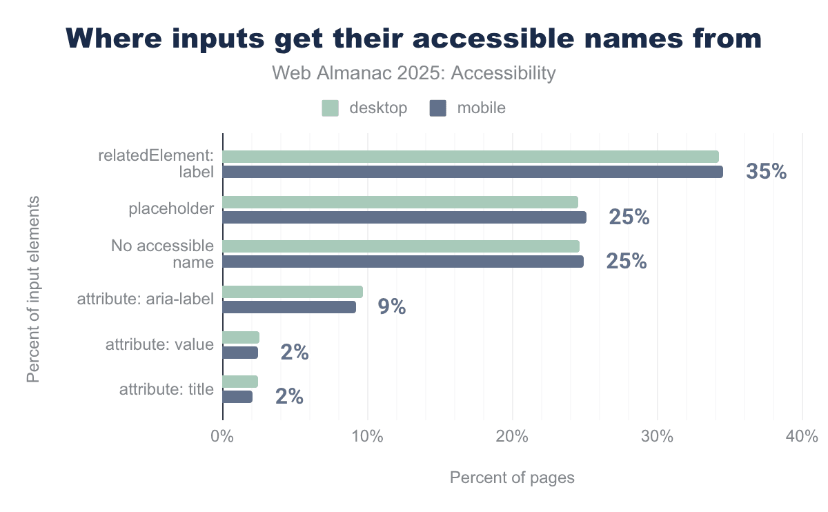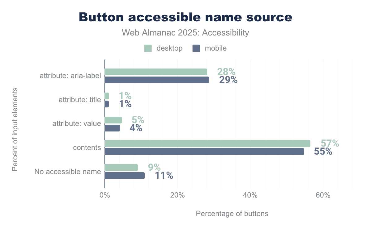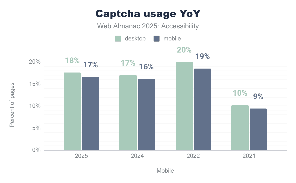 This year, text contrast pass rate improved by roughly 1% compared to 2024. But only 31% of mobile sites currently meet minimum color contrast requirements. Since mobile experiences depend heavily on clear visibility, this gap is a real problem for users accessing the web on their phones.