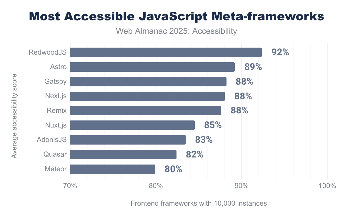 The choice of JavaScript framework also significantly influences a website’s accessibility outcomes. Using classifications from the State of JS report, we examined how different UI frameworks and meta-frameworks correlate with accessibility performance. This revealed patterns, shifts, and emerging concerns.