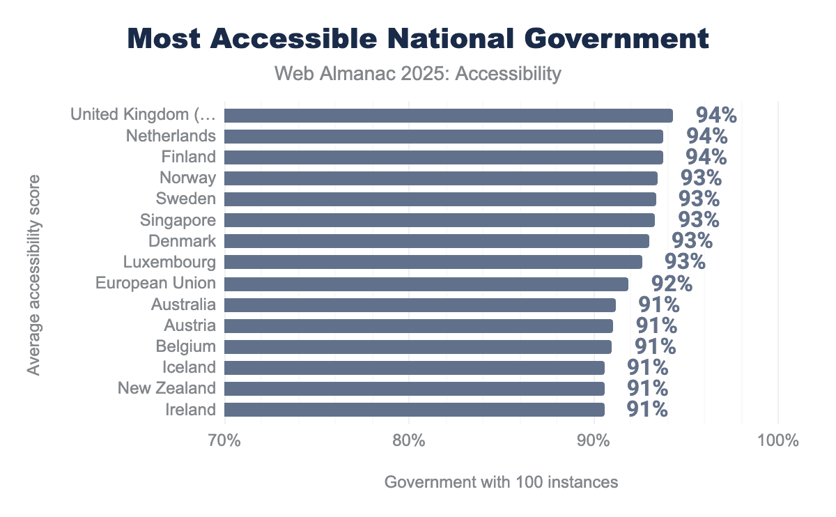 In the United Kingdom, we saw an improvement to 94% accessibility, up 2% from 2024. This reflects the benefits of standardized design systems, such as the UK Government’s Digital Service Standard, which prioritizes accessibility across all public digital services. The Netherlands, Luxembourg, and Finland continue to lead, with the Netherlands achieving 98% in previous years. They have maintained this position through consistent governance frameworks and design system prioritization.