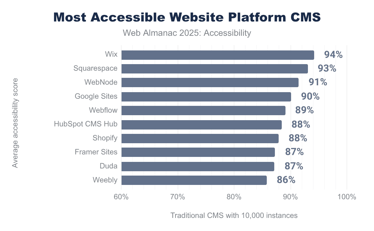 The data proves that CMS choice meaningfully impacts accessibility outcomes, even when content creators must take final responsibility for some decisions. Platforms with stricter design constraints and embedded accessibility defaults perform better, while those offering maximum flexibility leave accessibility decisions to users.