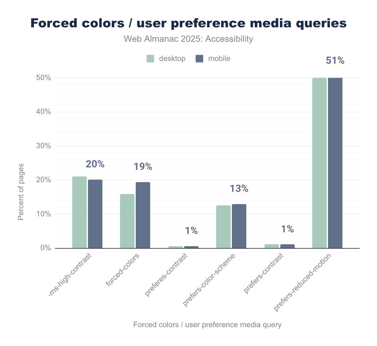 prefers-reduced-motion, appearing on about half of both desktop (49.99%) and mobile (50.55%) pages. -ms-high-contrast and forced-colors also show notable usage, at around 21% and 16% on desktop and 20% and 19% on mobile, respectively. Other features, such as prefers-color-scheme (about 13% on both platforms) and prefers-contrast (around 1%), are used much less, while several legacy or experimental features appear on virtually no pages.The most familiar queries, prefers-reduced-motion and prefers-color-scheme, remain widely supported by browsers. In 2025, adoption of these queries by websites shows little change. However, the use of forced-colors, which supports high-contrast modes for users with low vision, increased by 5% to 19%. Meanwhile, use of the outdated -ms-high-contrast media query has declined by 3% down to 20%. This reflects a gradual shift towards modern CSS standards.