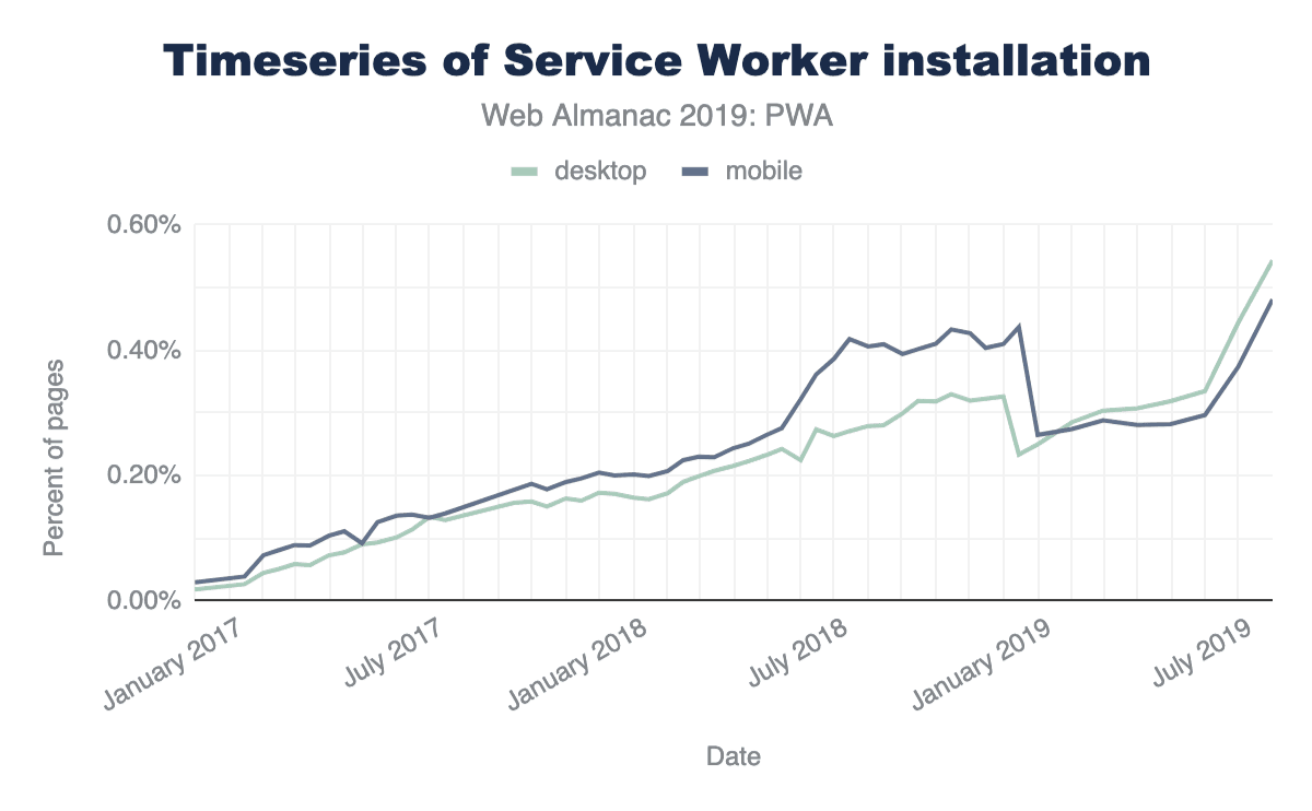 最初に検討する指標は、Service Workerのインストールです。 HTTP Archiveの機能カウンターを介して公開されたデータを見ると、すべてのデスクトップの0.44%とすべてのモバイルページの0.37%がService Workerを登録しており、時間の経過に伴う両方の曲線が急成長しています。