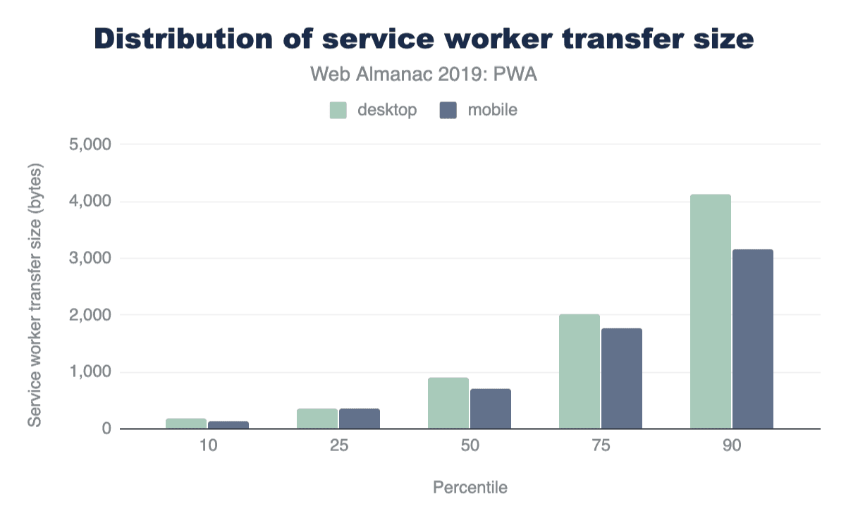 デスクトップのService Workerファイルの中央値は895バイトですが、モバイルでは694バイトです。すべてのパーセンタイルを通じて、デスクトップService WorkerはモバイルService Workerよりも大きくなっています。これらの統計は、importScripts()メソッドを使用して動的にインポートされたスクリプトを考慮しないため、結果は大きく歪む可能性が高いことに注意してください。
