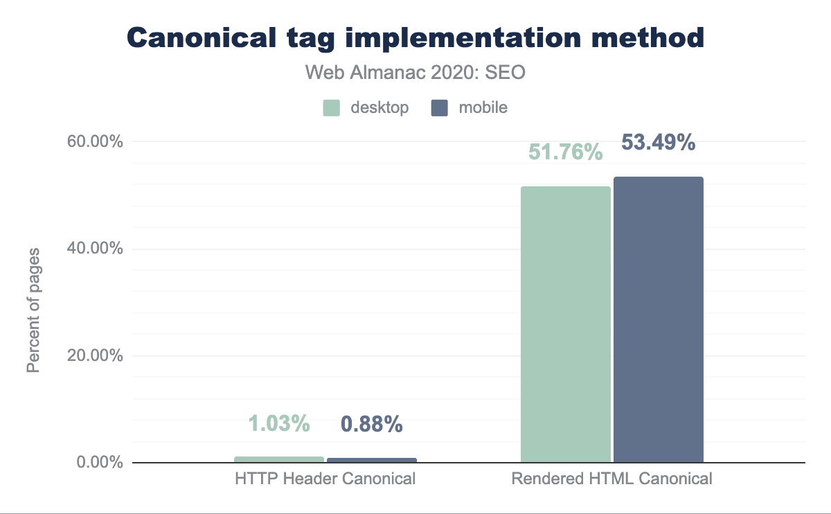 正準化URLはHTTPヘッダーやページのHTMLのheadを介して正準化リンクを使用する方法と、XMLサイトマップで提出する方法など、さまざまな方法で指定できます。正準化リンクの実装方法としてもっとも多く利用されているのはどれかを分析したところ、HTTPヘッダーに依存して実装しているのは、デスクトップページで1.03%、モバイルページでは0.88%に過ぎず、正準化タグはページのHTMLのheadを介して実装されることが多いことがわかりました。