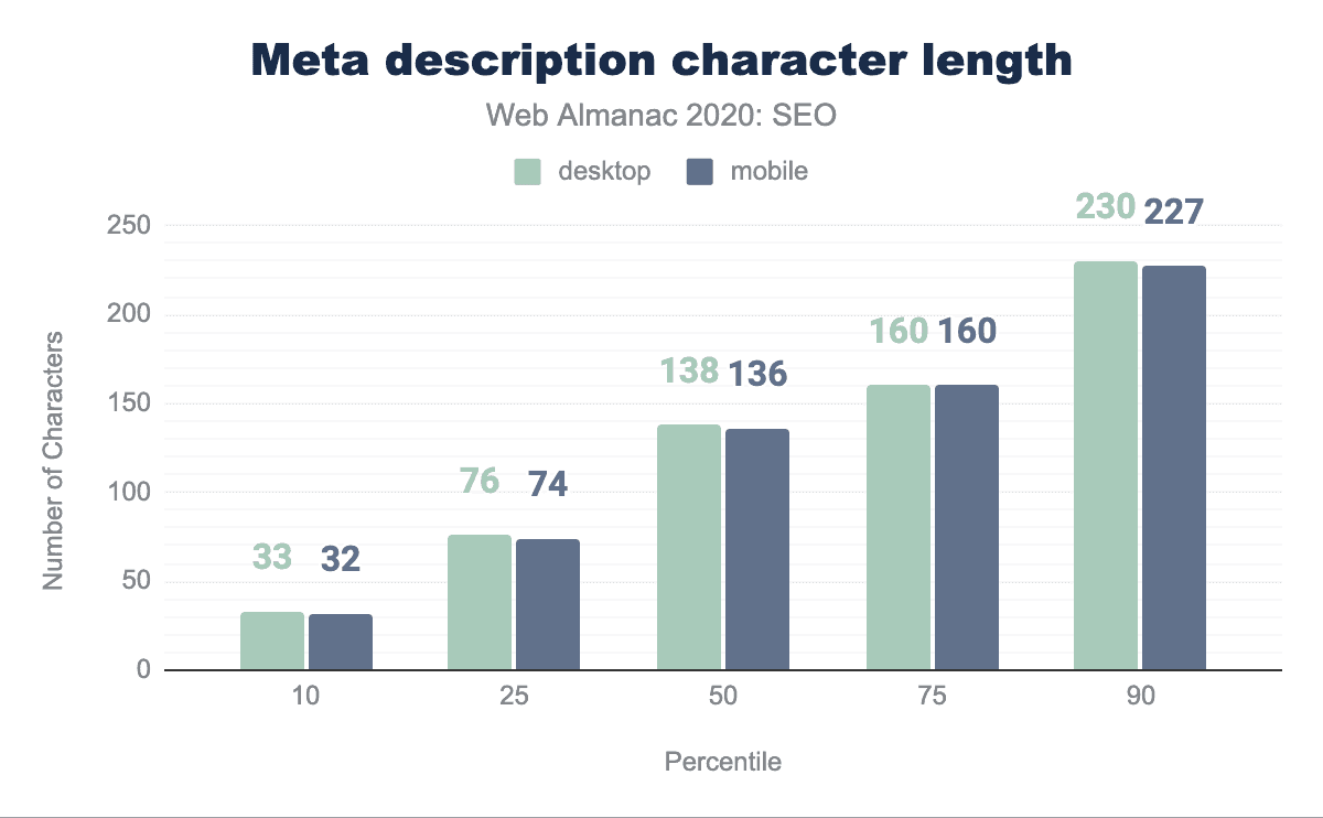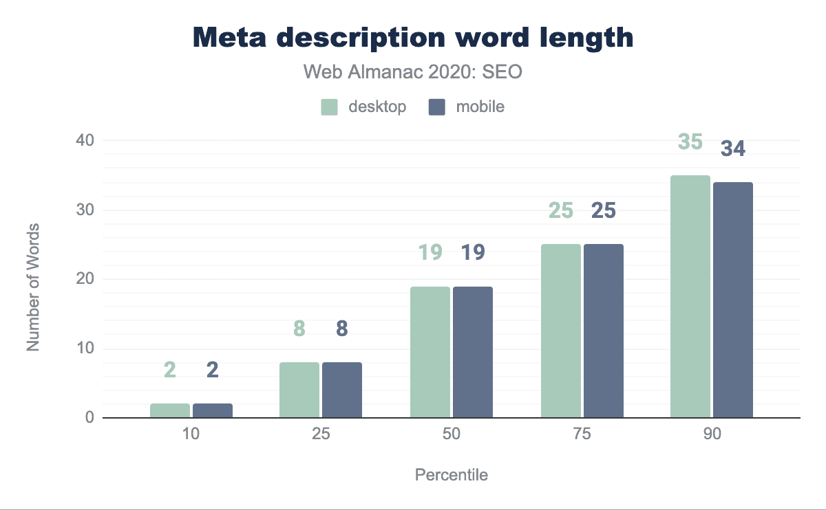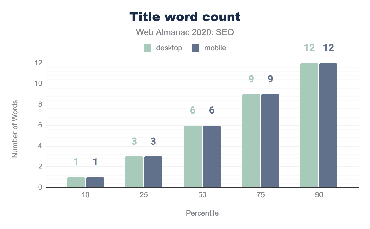 今年は、デスクトップページの中央値が402語、モバイルページの中央値は348語であることがわかりました。一方、昨年では、デスクトップページの中央値は346語、モバイルページの中央値は306語と、わずかに語数が少なかった。これはそれぞれ16.2%と13.7%の成長を示しています。