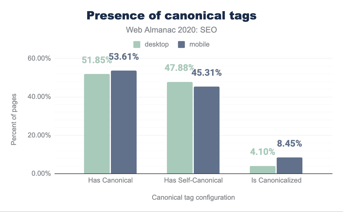 一方、今年は51.85%のデスクトップページがcanonicalタグを採用していることが判明し、47.88%が自己参照、4.10%が別のURLを指していることがわかりました。
